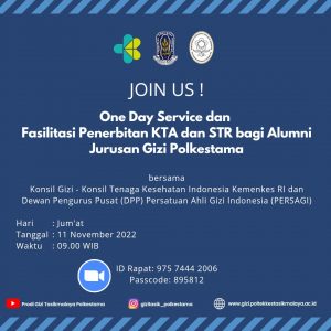 Pada hari ini, 11 November 2022 secara daring telah dilakukan fasilitasi dan pendampingan pengajuan dan penerbitan Kartu Tanda Anggota (KTA) Persagi dan Surat Tanda Registrasi (STR) bagi Alumni Jurusan Gizi Polkestama. Acara yang dilaksanakan secara daring yang diselenggarakan oleh Jurusan Gizi kepada Civitas Akademika (Dosen, Tenaga Kependidikan, Mahasiswa Tingkat 3) dan Alumni ini diikuti oleh lebih dari 100 orang. Civitas akademika dan alumni yang mengikuti kegiatan ini berasal dari Program Studi Diploma Tiga Gizi Tasikmalaya dan Program Studi Diploma Tiga Gizi Cirebon. Narasumber pada kegiatan ini adalah Bapak Zul Amri, DCN, M.Kes selaku Ketua Bidang Registrasi – Konsil Gizi – Konsil Tenaga Kesehatan Indonesia (KTKI) dan Bapak Rian Ardiansyah selaku pengurus DPP Persagi. Diskusi dan pendampingan berjalan dengan efektif, bersifat hands on, dan setiap permasalahan teknis terkait pengajuan KTA dan STR dapat langsung diselesaikan pada saat itu.