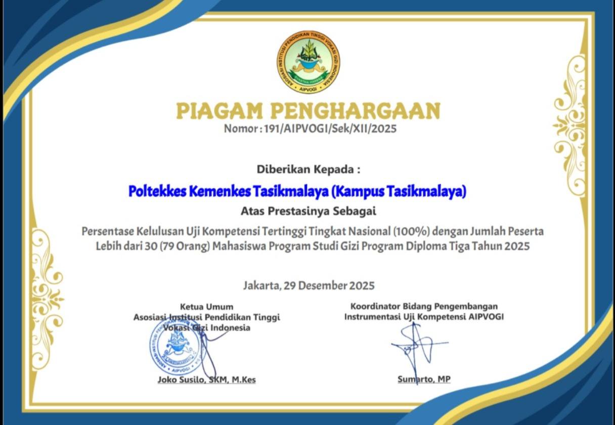 Sebagai kado akhir tahun 2025, semua Program Studi (Program Studi Gizi Tasikmalaya dan Program Studi Gizi Cirebon) pada Jurusan Gizi Poltekkes Kemenkes Tasikmalaya mendapatkan Penghargaaan sebagai peraih *Persentase Kelulusan Uji Kompetensi Tertinggi Tingkat Nasional...