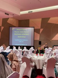 Pada hari Selasa, 17 Mei 2022 telah dilaksanakan pelatihan Tabel Manner untuk seluruh mahasiswa tingkat 1 (kelas 1A dan 1B) Program Studi Diploma Tiga Gizi Tasikmalaya, Jurusan Gizi, Politeknik Kesehatan Kemenkes Tasikmalaya. Kegiatan ini dilaksanakan di Hotel Grand Metro, Kota Tasikmalaya secara luring. Narasumber adalah ahli dari Hotel Grand Metro, Kota Tasikmalaya. Pelatihan ini juga didampingi oleh dosen, pranata laboratorium pendidikan, dan tenaga kependidikan Program Studi Diploma Tiga Gizi Tasikmalaya.